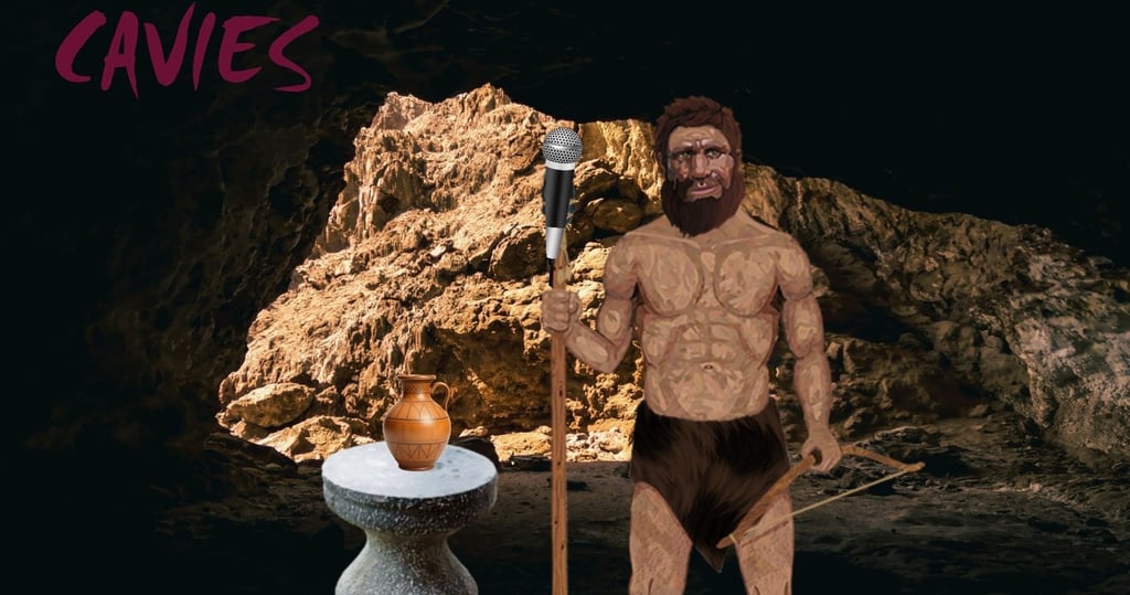He points to an image of a caveman standing in front of a tired bunch. Our Cavemedian, gets up there like a real professional, and does Setup Punchline.